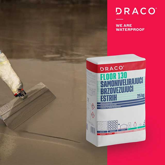 Tako, se među epoxy i poliuretanskim podovima, od sada nalazi i DRACO FLOOR 130, koji se može svrstati u cementne podove. DRACO FLOOR 130 je samonivelirajuća cementna masa sa specijalnim aditivima koja se koristi za ravnavanje i zaglađivanje grubih površina podova. Nanosi se u debljini od 3 do 30mm u jednom radnom koraku.