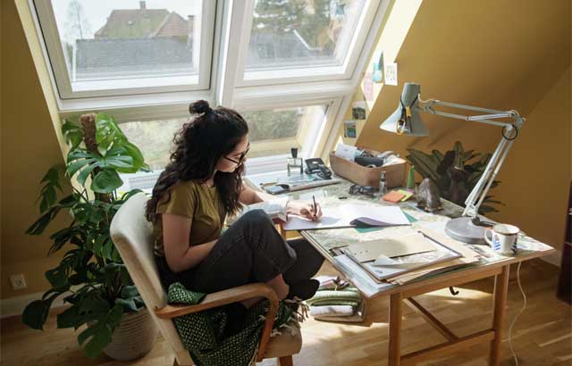 Uz VELUX unutrašnje i spoljašnje roletne soba će ostati topla zimi, a leti se neće pregrevati, tako da možete održavati udobno radno okruženje pri radu od kuće. Štaviše, oni takođe mogu doprineti u smanjenju potrošnje energije u vašem domu za grejanje i hlađenje.