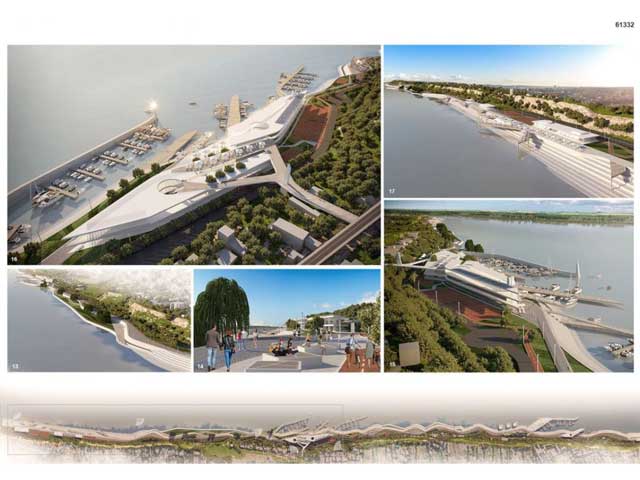 Osnovna ideja rešenja autorskog tima Revolution Architects je da se oblikuje obaloutvrda uz minimalne izmene oblika postojeće obale Dunava i narušavanja flore koja je zatečena. Smenjuju se marine, parkovi, ugostiteljski objekti i sportsko-rekreativni sadržaji.