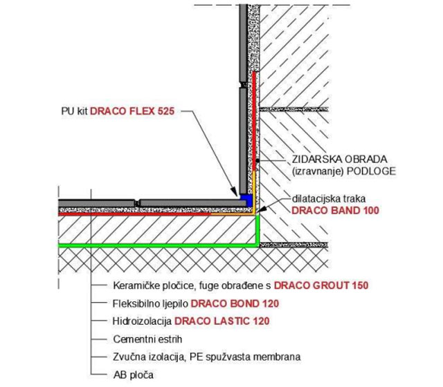 - Na kontaktu horizontalnih i vertikalnih površina kao i na kontaktu zidova i tuš kade ugrađuje se dilatacijska zaptivna traka DRACO BAND 100. Traka se utapa u prvi sloj premaza DRACO LASTIC 150 i drugim potpuno prekriva.