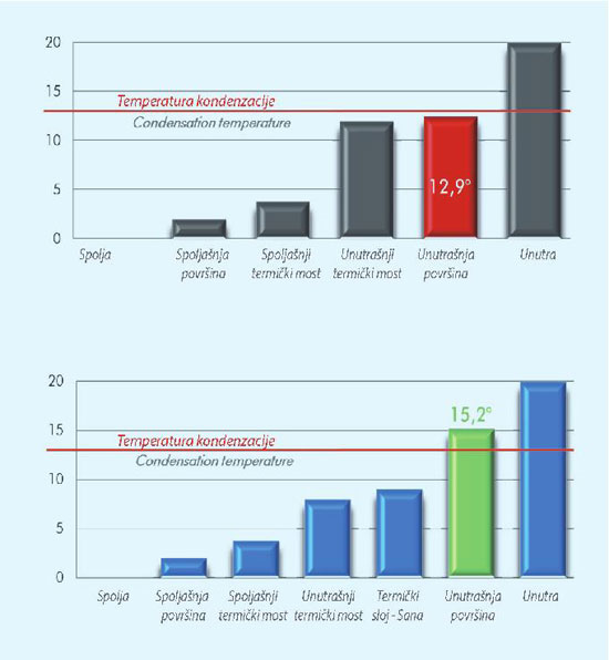 Sa debljinom od 4mm i prosečnom temperaturom unutra-spolja od 5-20°C i 65% R.H, STYROCOAT rešava problem unutrašnje kondenzacije i stvaranja buđi nastale usled hladnog mosta ili loše zidne izolacije.