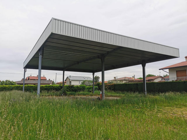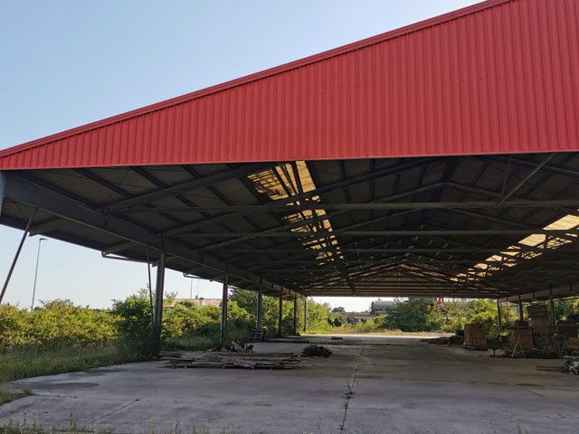 Površina prve hale je 300m2, a sav materijal je pocinkovan. Dimenzije su 15x20m, visina 5m. Raspon između stubova je 15x15m, a nadstrešnica pod istim krovom je 5x15m, pa su ukupne dimenzije objekta 15x20m.