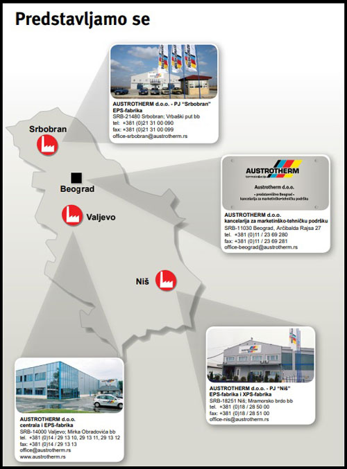 Austrotherm d.o.o. je već decenijama srpski i regionalni lider u proizvodnji termoizolacionih materijala (EPS i XPS) zahvaljujući ne samo kvalitetu svojih proizvoda i usluga, već i zahvaljujući kvalitetnoj i širokoj mreži distributera – trgovaca građevinskim materijalima – koja se prostire čitavom teritorijom Srbije, ali i susedne Crne Gore. Na internet stranici www.austrotherm.rs, u gornjem desnom delu postoji rubrika: Distributeri u vašoj blizini.