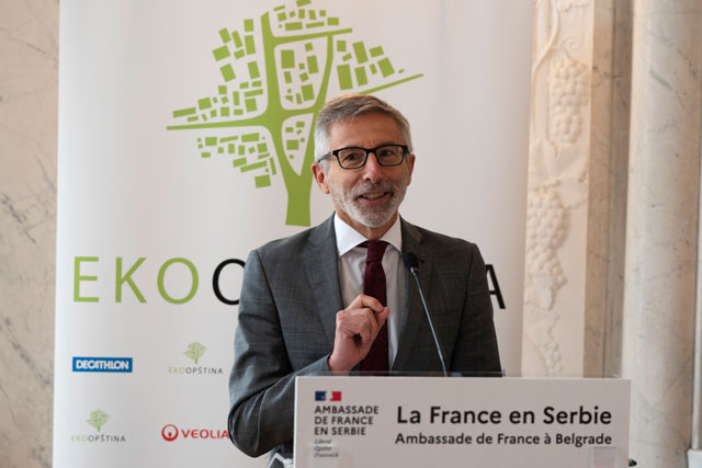 Izrazio je svoje zadovoljstvo povodom najave nastavka projekta "Ekoopština" sledeće godine, sa još više partnera. Posebno se osvrnuo na oznaku "EU za Zelenu agendu u Srbiji" koju je konkurs dobio zahvaljujući saradnji sa novim partnerima iz UNDP-a i Delegacije Evropske unije, kao i na uspostavljanje razmene između gradova-pobednika. Naime, saradnja sa DEU i UNDP će dovesti do konkretne dalje saradnje i do nagradnih studijskih putovanja između pojedinih francuskih gradova i nagrađenih opština i gradova u Srbiji. Ambasador je dao podršku i evropskom programu "Climate Diplomacy Week" koji će uskoro pokrenuti njegove kolege - diplomate EU i srpske institucije.