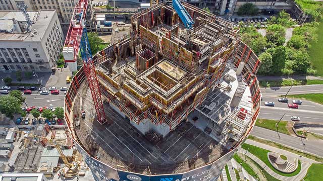 Za izgradnju poslovnog tornja visine 132m korišćena je zaštitna penjajuća oplata koja se sastojala od elemenata RCS sistema podizanja po šinama u kombinaciji sa VARIO VT zidnom oplatom od drvenih nosača kao i DOMINO panelnom oplatom. Jezgro je bilo podeljeno u dve celine, od kojih je jedna "bežala" 3, a druga 2 etaže u odnosu na međuspratne ploče.