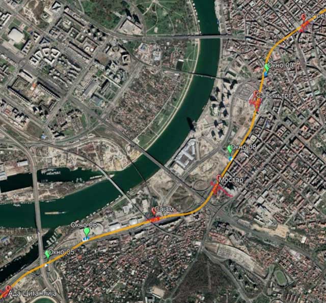 Trasa linije 1, položaj stanica i okana (Foto: Egis/Studija o proceni uticaja na životnu sredinu projekta izgradnje objekata Beogradskog metroa)
