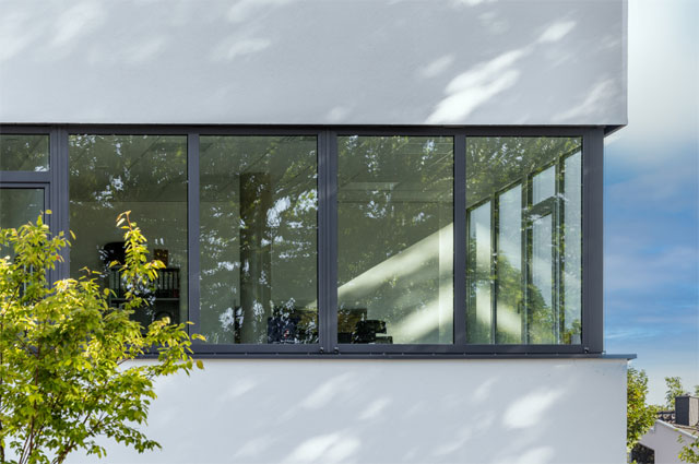 S druge strane, severno pročelje karakterišu prozorski prorezi od poda do plafona široki tek 20 centimetara, postavljeni ispred zida kako bi se sačuvala puna staklena površina. Visokoefikasni sistem GEALAN S 9000 daje odlučujući doprinos energetski efikasnoj obnovi stambene kuće, dok površina GEALAN-acrylcolor® u savremenoj antracit sivoj boji karakteriše novo životno okruženje.