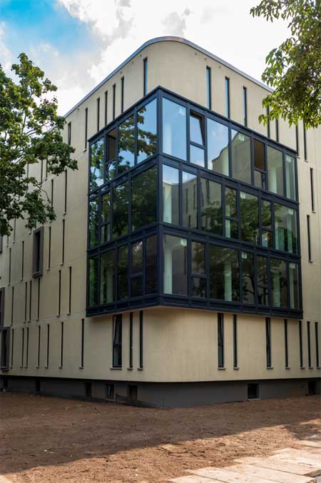 Prozori stambene kuće u ulici Alte Herrenhäuser u Hannoveru imaju neobične formate. S jedne strane, povezani su u uglovima na tri sprata - tri zajedničke prostorije unutar njih deluju svetlo i primamljivo zahvaljujući tome "prozor u grad" u visini sobe i nudi prekrasan pogled na neposredno spoljašnje zelenilo.