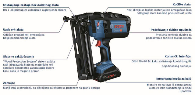 Pored svega navedenog, Bosch GNH 18V-64 M Professional se može pohvaliti da ima i sistem za otklanjanje zastoja eksera i to bez dodatnog alata. Prostim odbravljivanjem metalne zaštite na vrhu alata se pristupa zaglavljenim ekserima i oni se uklanjaju. Kako spada u klasu 18V alata, kompatibilan je sa svim Bosch akumulatorima od 18V a maksimalne rezutate postiže sa ProCORE akumulatorima.