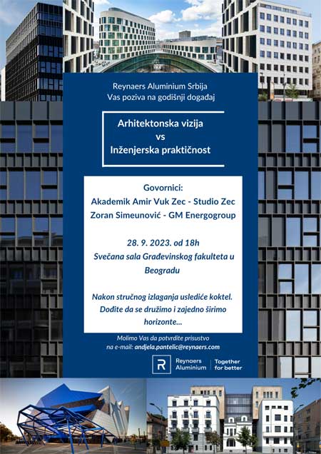 Na Građevinskom fakultetu u Beogradu 28. septembra biće održano stručno izlaganje pod nazivom "Arhitektonska vizija vs Inženjerska praktičnost", u organizaciji kompanije Reynaers Aluminium Srbija.