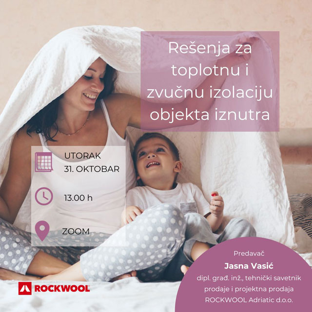 Webinar će biti održan 31. oktobra u periodu od 13 do 14 časova, putem Zoom platforme. Predavač je Jasna Vasić dipl. građ. inž, tehnički savetnik prodaje i projektne prodaje u kompaniji ROCKWOOL Adriatic d.o.o.