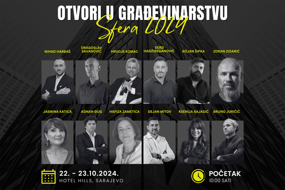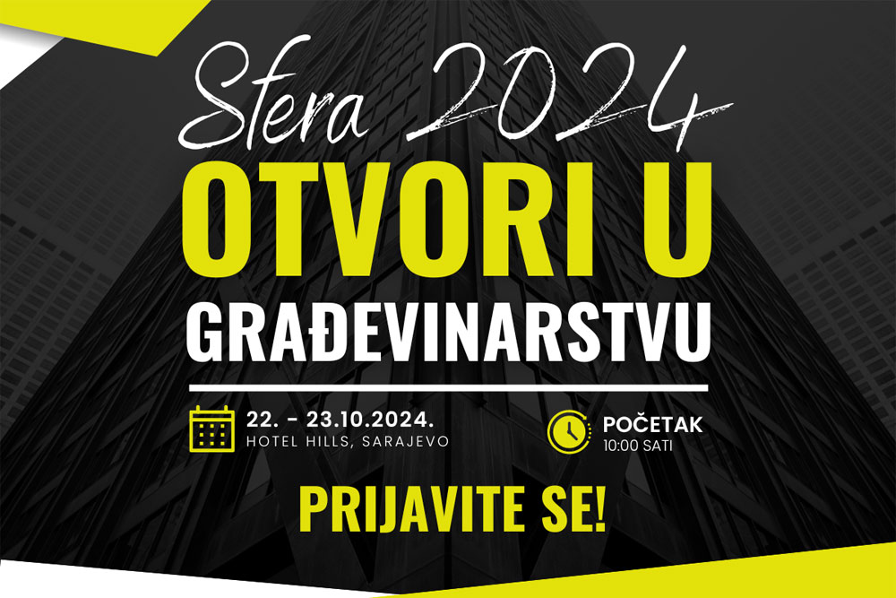 "Sfera 2024: Otvori u građevinarstvu" je konferencija i sajam koji će se održati 22. i 23.10.2024. u Hotelu Hills u Sarajevu.