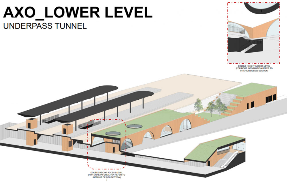 Projekat predviđa prizemnu građevinu sa ravnim ozelenjenim krovom i dve lanterne koje će osvetljavati pothodnik i trg. Ukupna bruto površina zgrade iznosi 713,57 kvadratnih metara.